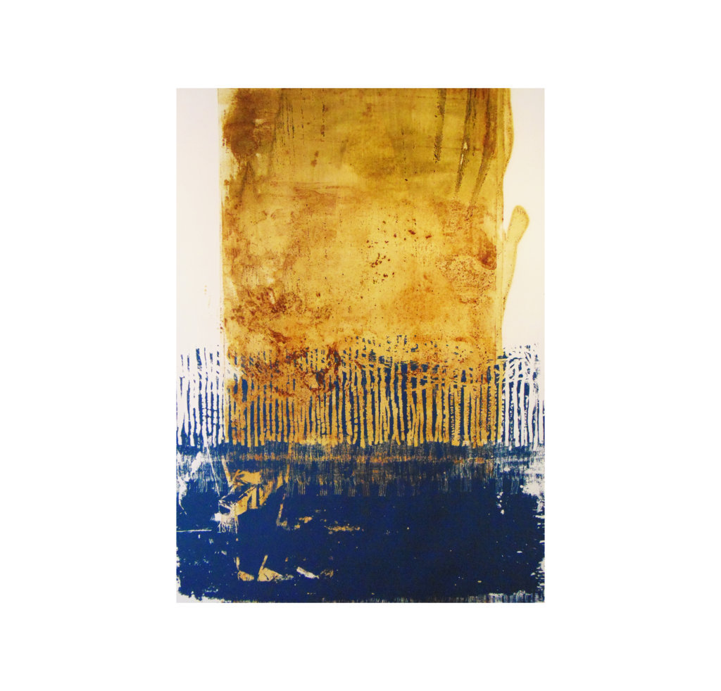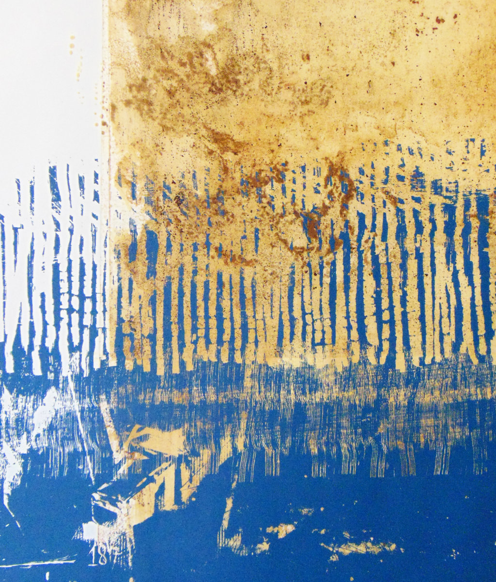 Questa serie di stampe nasce dall’osservazione della marea ed il suo costante cambiamento. L’acqua sommerge le rive e poi si ritira, ad ogni suo passaggio traccia sulla lastra di ferro, disegni e striature uniche. La stampa realizzata con il torchio imprime la lastra sulla carta e in alcune copie, l’artista aggiunge una fascia colorata che vuole rappresentare l’acqua alta.